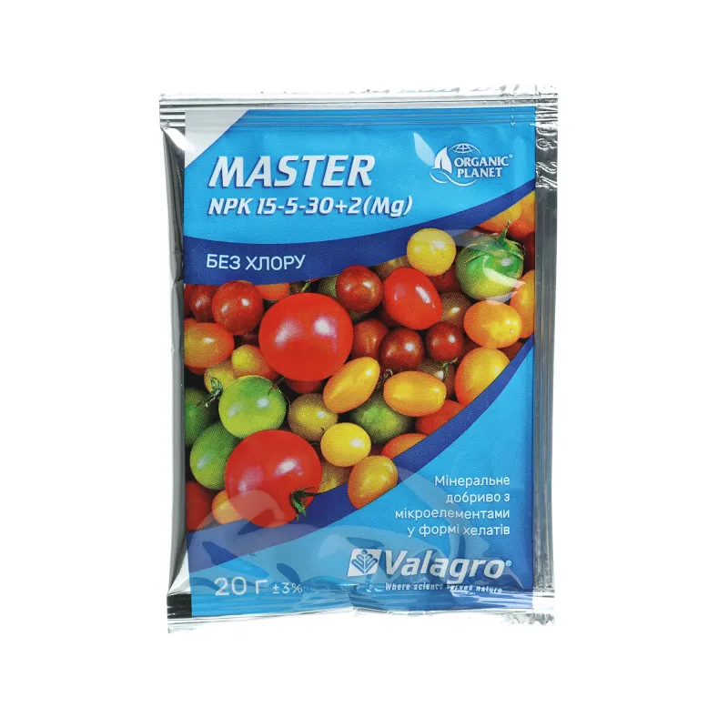Склад:Азот (N) – 15 % (из них NO3 – 8,4; NH4 – 3,6; NH2 – 3); Фосфор (Р2О5) – 5 %; Калий (К2О) – 30 %; Оксид магния (MgO) – 2%.