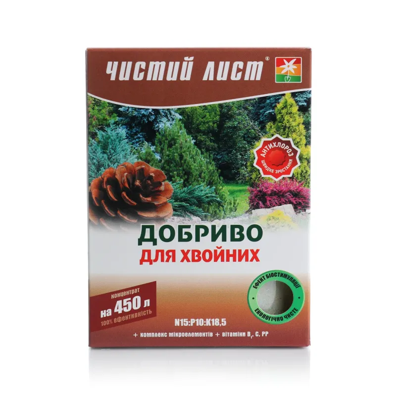Удобрение "Чистый лист" применяется для подкормки хвойных деревьев и кустов, что позволяет: